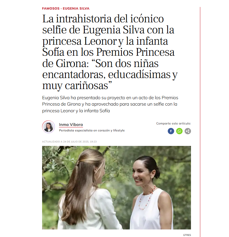 Prensa El selfi de Leonor y Sofía en Girona con apoyo a las mujeres con vocación científicaEl Mundo, 24 de julio de 2025 El selfie de Eugenia Silva con Leonor y Sofía: encuentro en Girona por su proyecto de formación tecnológica para niñas y jóvenesVanity Fair, 24 de julio de 2025 La princesa Leonor y la infanta Sofía conocen la iniciativa 'Ellas Hablan Código' de la mano de la modelo Eugenia SilvaLa Vanguardia, 24 de julio de 2025 El primer encuentro de Eugenia Silva con Leonor y Sofía de Borbón: «Son un referente»El Debate, 24 de julio de 2025 Todos los detalles del encuentro de Eugenia Silva con la princesa Leonor y la infanta Sofía: "Ha sido un día especial"El Español, 24 de julio de 2025 Eugenia Silva presenta la iniciativa 'Ellas Hablan Código' a Leonor y a Sofía: "El talento no tiene género ni fronteras”Magas, 24 de julio de 2025 El divertido selfie de Eugenia Silva con la princesa Leonor y la infanta Sofía: "Ha sido un día especial"Antena 3, 24 de julio de 2025 Eugenia Silva comparte la iniciativa "Ellas Hablan Código" con la Princesa Leonor y la Infanta Doña Sofía en Sant Martí VellLa Razón, 24 de julio de 2025 La intrahistoria del icónico selfie de Eugenia Silva con la princesa Leonor y la infanta Sofía en los Premios Princesa de Girona: “Son dos niñas encantadoras, educadísimas y muy cariñosas”Lecturas, 24 de julio de 2025 Eugenia Silva, tras su encuentro con la princesa Leonor y la infanta Sofía: "Son dos niñas encantadoras y educadísimas"Hola!, 24 de julio de 2025 El guiño de Eugenia Silva a la princesa Leonor a través de la moda en su encuentro con la Familia Real en GironaHola!, 24 de julio de 2025 Eugenia Silva sorprende a la princesa Leonor y la infanta Sofía con un proyecto propio que impulsa el talento femenino en la tecnología20minutos, 24 de julio de 2025 El nuevo proyecto de Eugenia Silva: “Quiero usar mi voz para inspirar a niñas a estudiar y crear tecnología"Magas, 11 de julio de 2025 Eugenia Silva une fuerzas con la Fundación Princesa de Gerona por la formación STEMOkDiario, 7 de julio de 2025 Eugenia Silva: “La programación es un superpoder y, como tal, no tiene género”La Vanguardia, 3 de julio de 2025 Nace «Ellas Hablan Código» para promover el aprendizaje de las ciencias de la computaciónFundación Princesa de Girona, 30 de junio de 2025 Eugenia Silva: “La programación es un superpoder, es el lenguaje del futuro”El País, 3 de julio de 2025 Las becas con las que Eugenia Silva potencia a los científicos del futuro: "Quiero demostrar que la informática no es una cuestión de género".Hola!, 30 de junio de 2025 'Ellas Hablan Código', el proyecto que impulsa el futuro de las niñas en el ámbito científico y tecnológico.Informativos Telecinco, 30 de junio de 2025